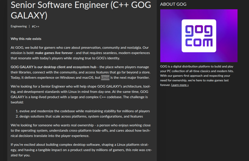 GOG is seeking a Senior Software Engineer with C++ experience to modernize the GOG GALAXY desktop client and spearhead its Linux development